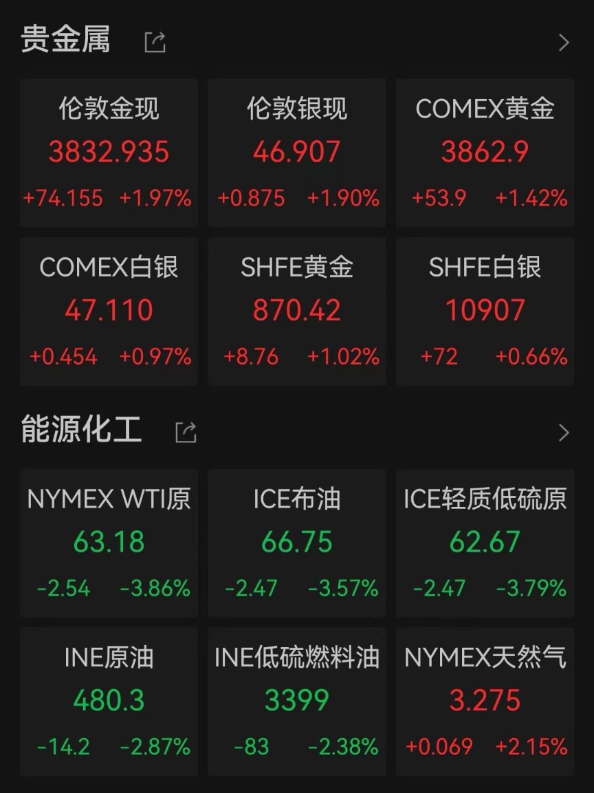 当地时间9月29日,国际贵金属期货普遍收涨。COMEX黄金期货主力合约涨1.42%报3862.9美元/盎司,COMEX白银期货主力合约涨0.97%报47.11美元/盎司;现货黄金盘中刷新历史新高,至3834.12美元/盎司,收盘涨近2%。