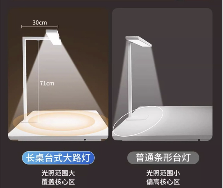 大灯条,桌面中间照度可达1500lux,不仅亮度够高,辐射范围也够广,照度也更均匀。