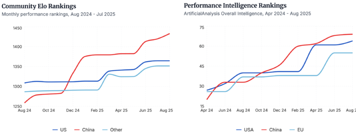 ▲无论是社区对国产开源模型的评价,即 Elo 排名,还是在 ArtificialAnalysis 基准测试中,按地区划分的性能对比,国产开源都在领先位置|图片来源:https://www.atomproject.ai/