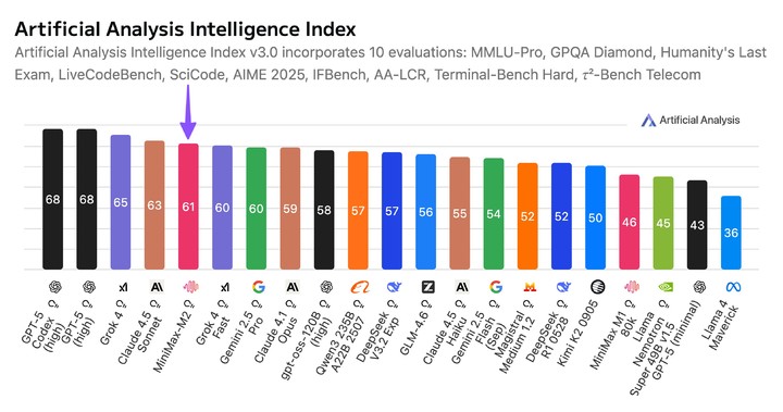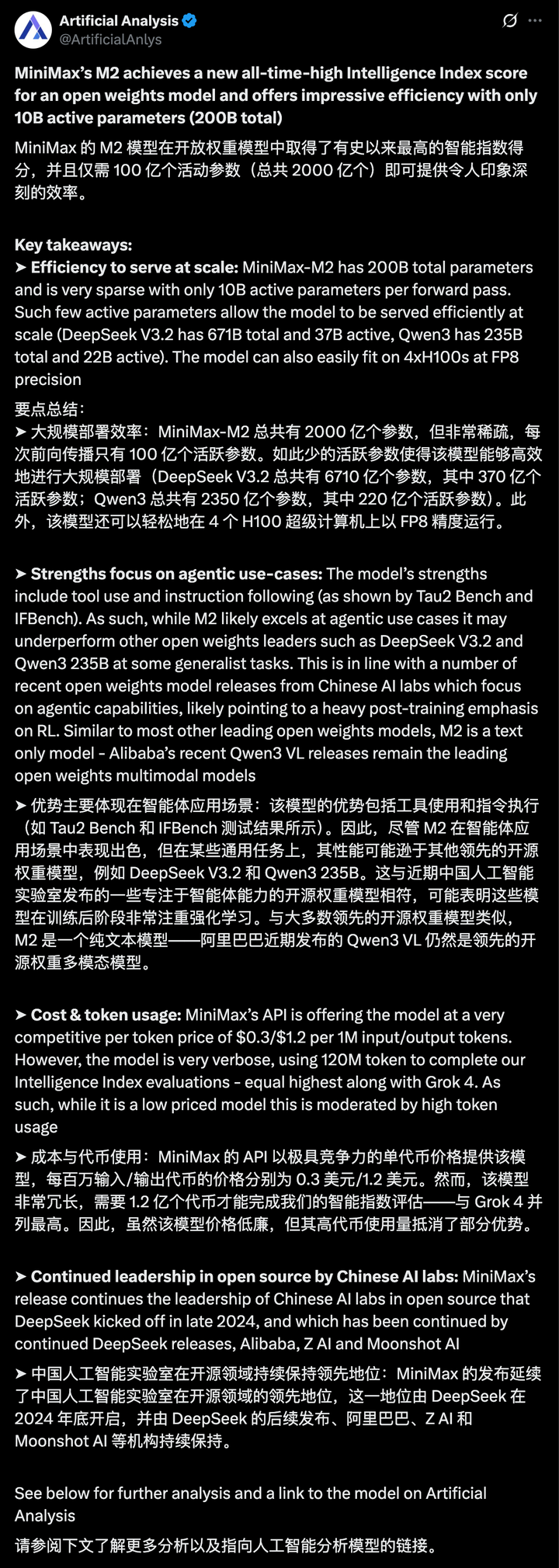 大模型分析平台,Artificial Analysis 在发 X 介绍 MiniMax M2 的综合榜单表现时,也提到了国产开源,他说。