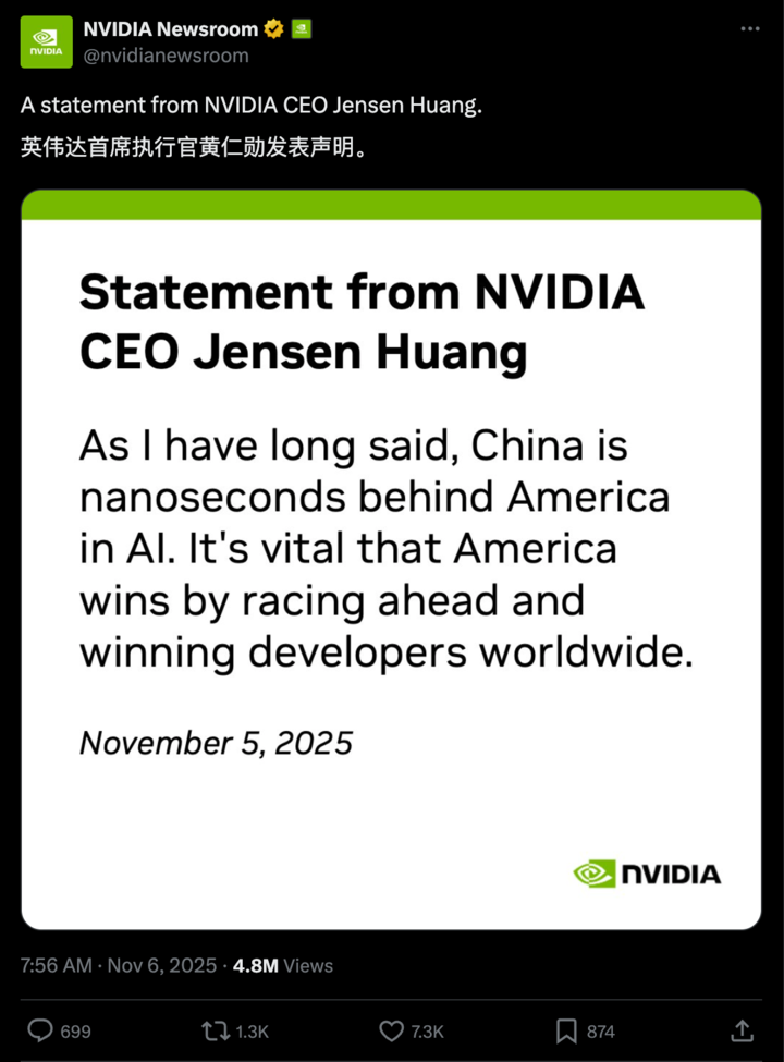 上个月,黄仁勋在人工智能峰会上接受采访时表示,「中国将在人工智能竞赛中获胜。」尽管随后他立刻通过英伟达官方账号 X 发表声明,收回了之前的言论,澄清说中国实际上「在人工智能竞赛中,落后美国仅几纳秒。」