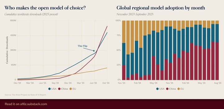 a16z 前段时间统计了开源模型的数据,结果显示,国产开源模型的累计下载量,不仅超过了美国模型,而且领先优势还在不断扩大。