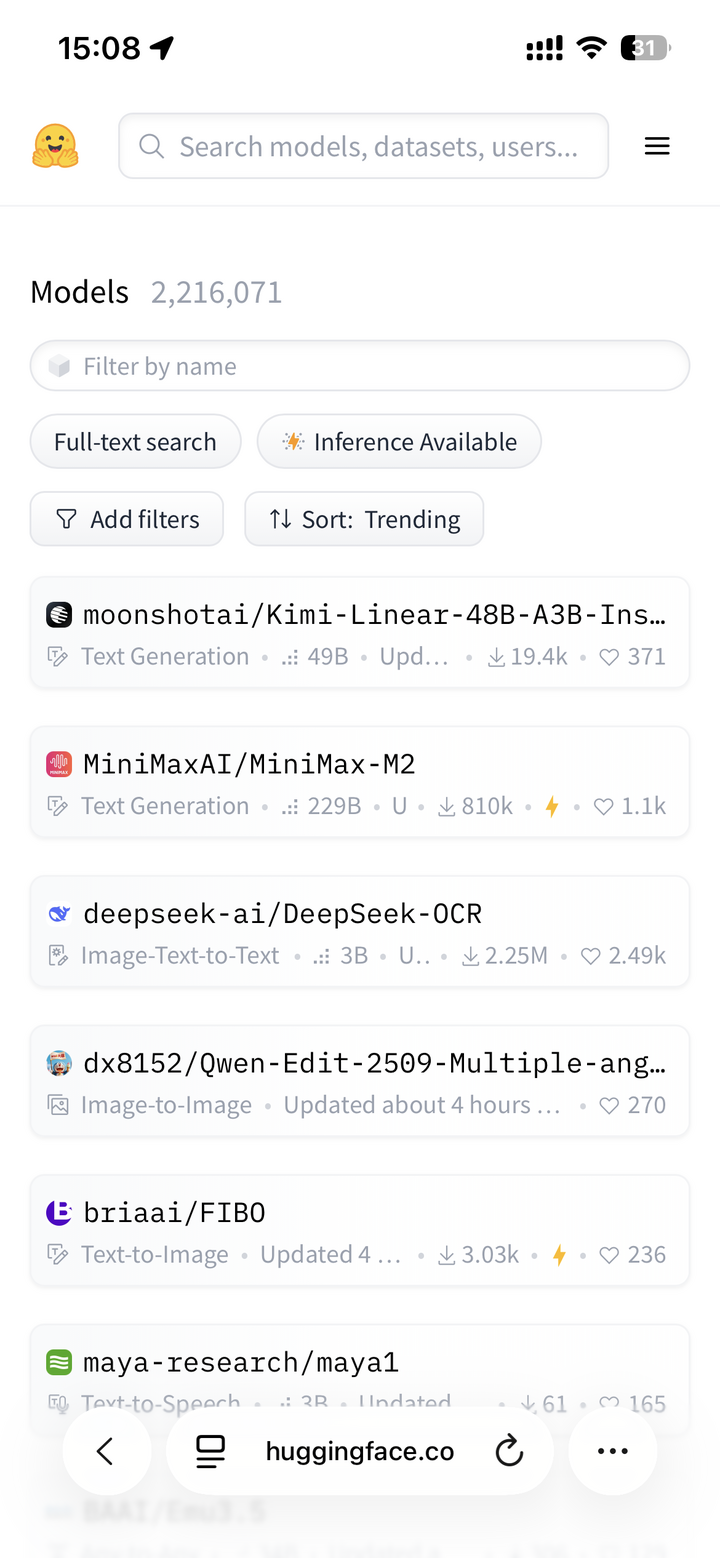 ▲ Hugging Face 上,热门榜单前四个,都是国产开源模型;图片来源:https://huggingface.co/models?sort=trending