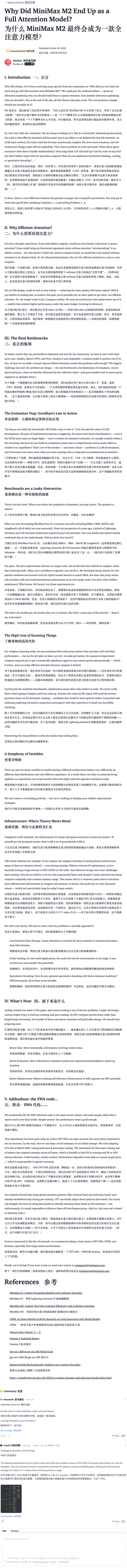 MiniMax 团队也专门写了一篇技术博客来介绍,为什么又走回了原点,继续选择全注意力机制,这种增加训练和推理压力的方式。