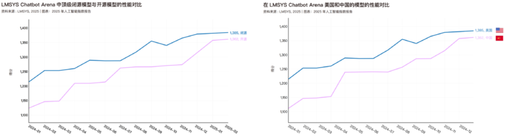 今年四月,斯坦福大学也发表了一份 2025 人工智能指数报告,里面统计了开源模型和闭源模型的性能对比,以及中美两国模型的性能对比。这份报告的数据只截止到今年 2 月份,明年再看的时候,国产开源大概会顺利超过闭源和美国。